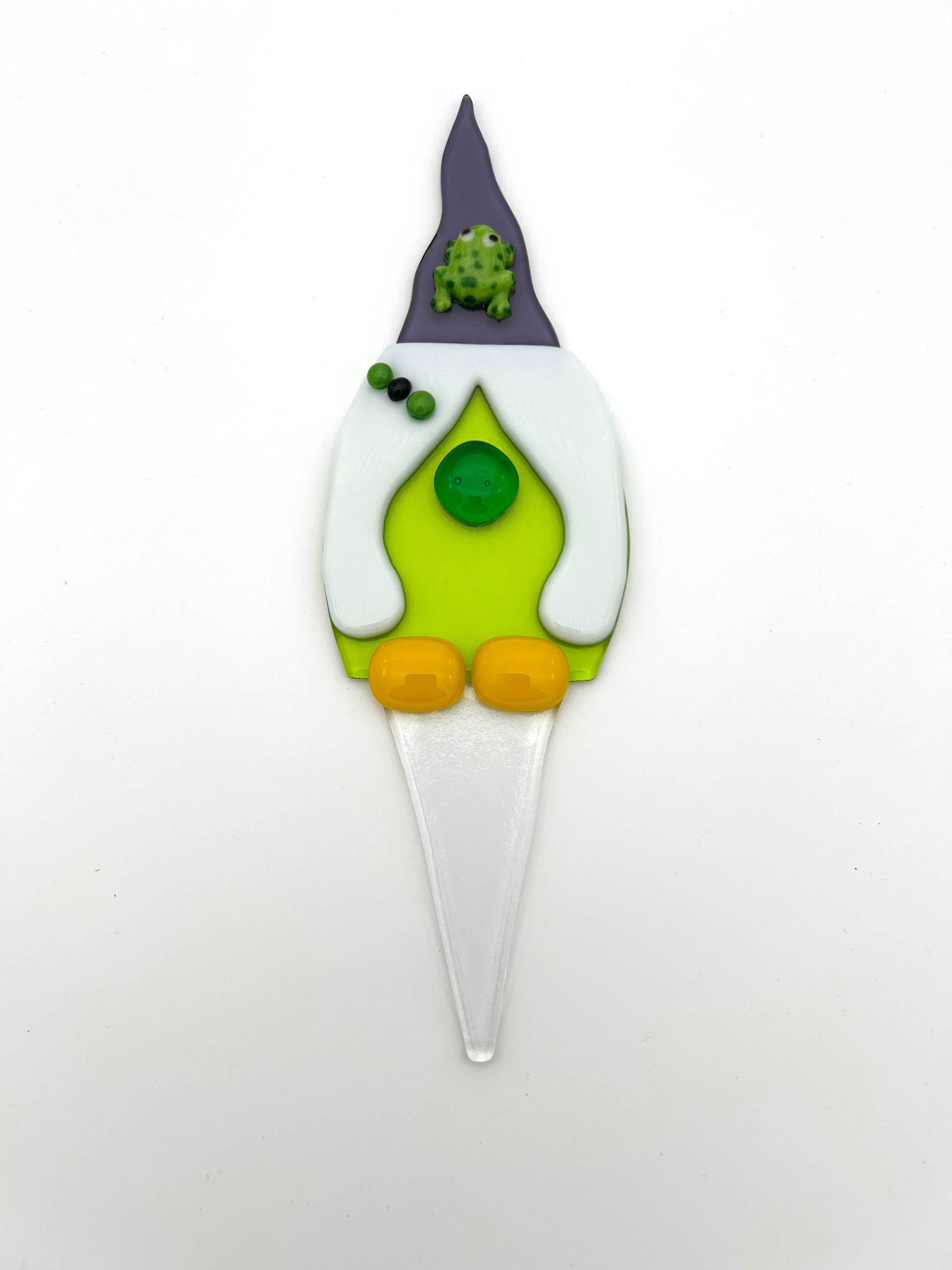 Garden Art Gnome Girl Green Coat Purple Hat with Frog