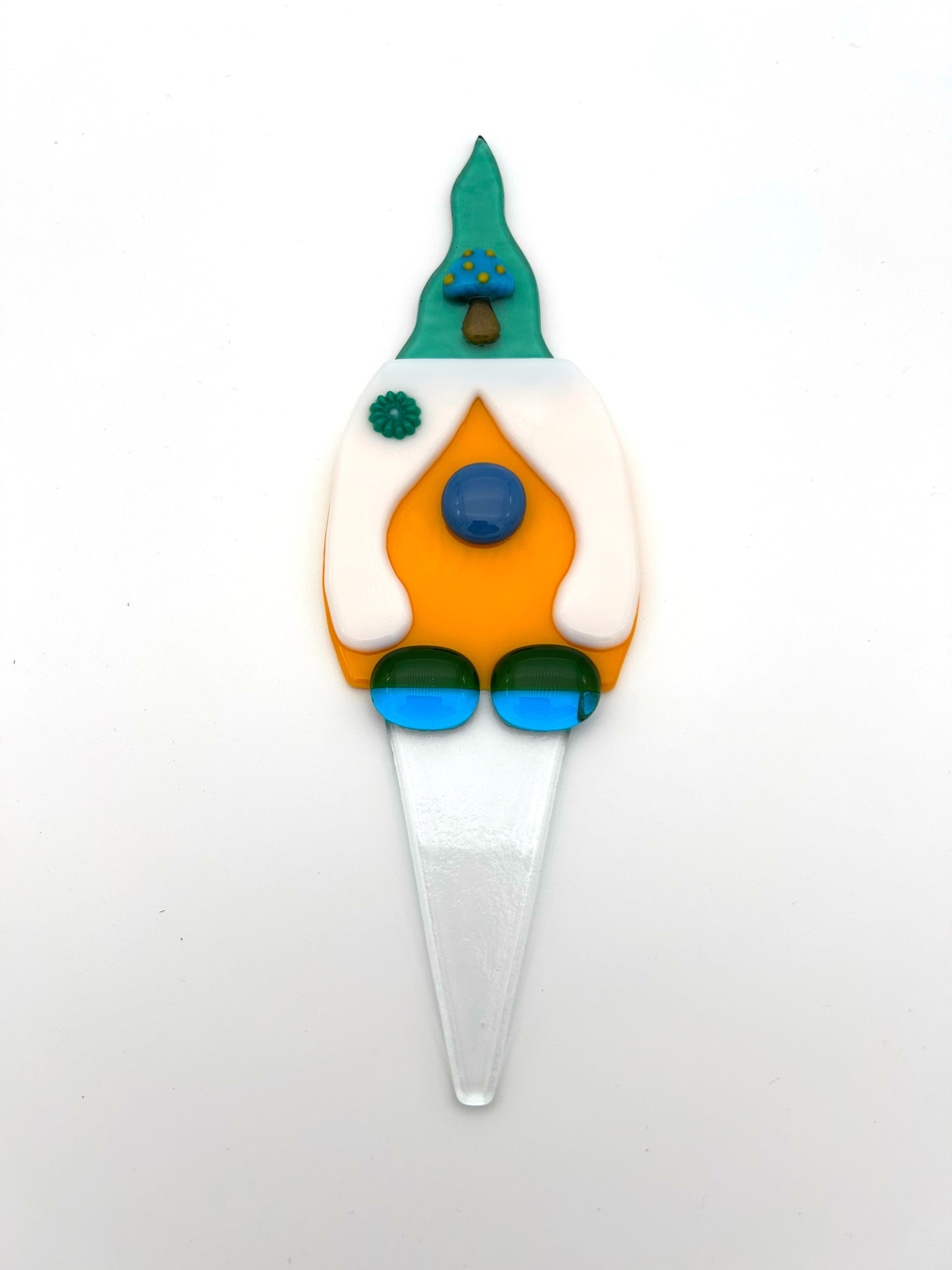Garden Art Gnome Girl Yellow Coat Green Hat with Mushroom