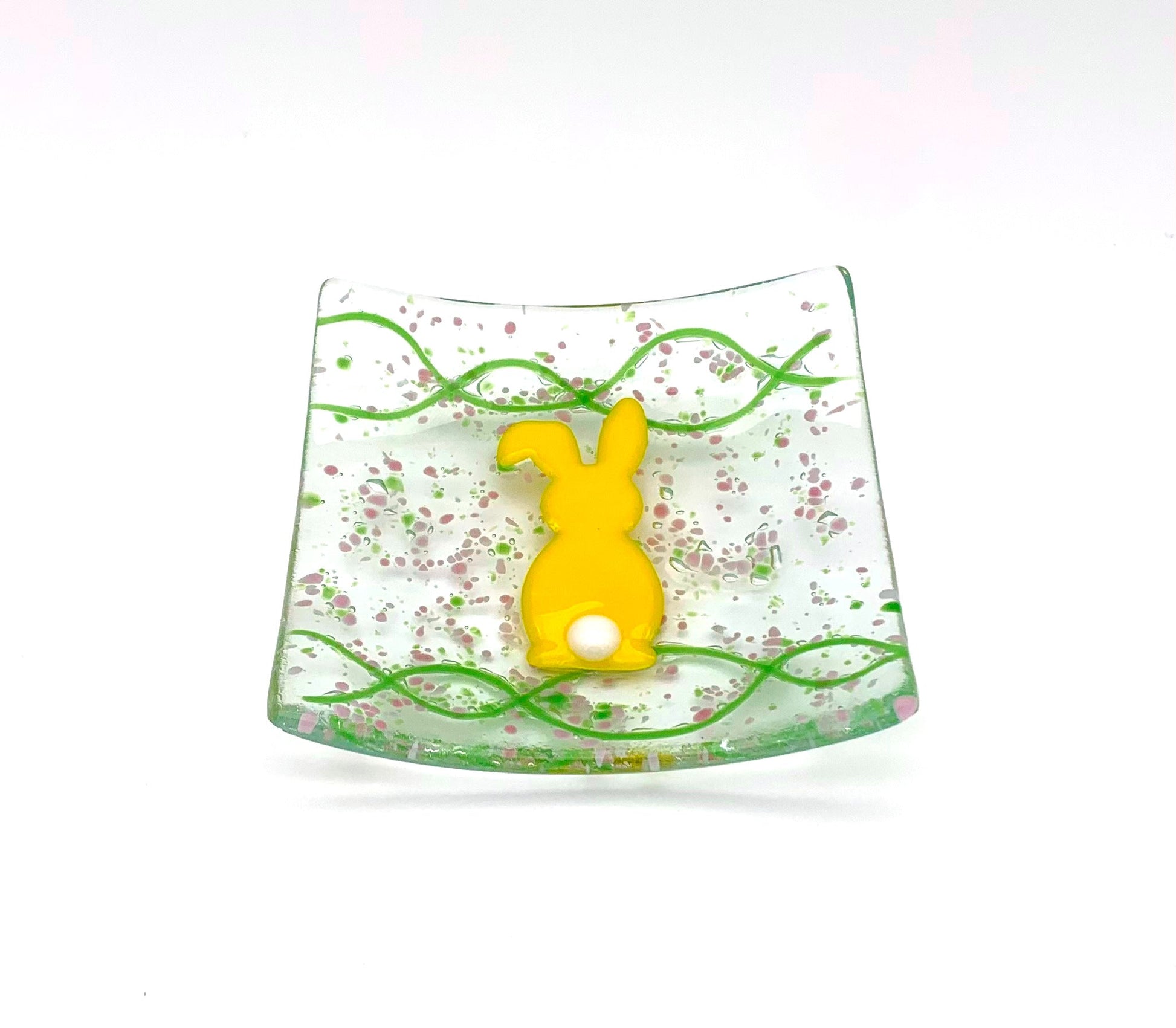 Square Dish Yellow Bunny on Green and Pink